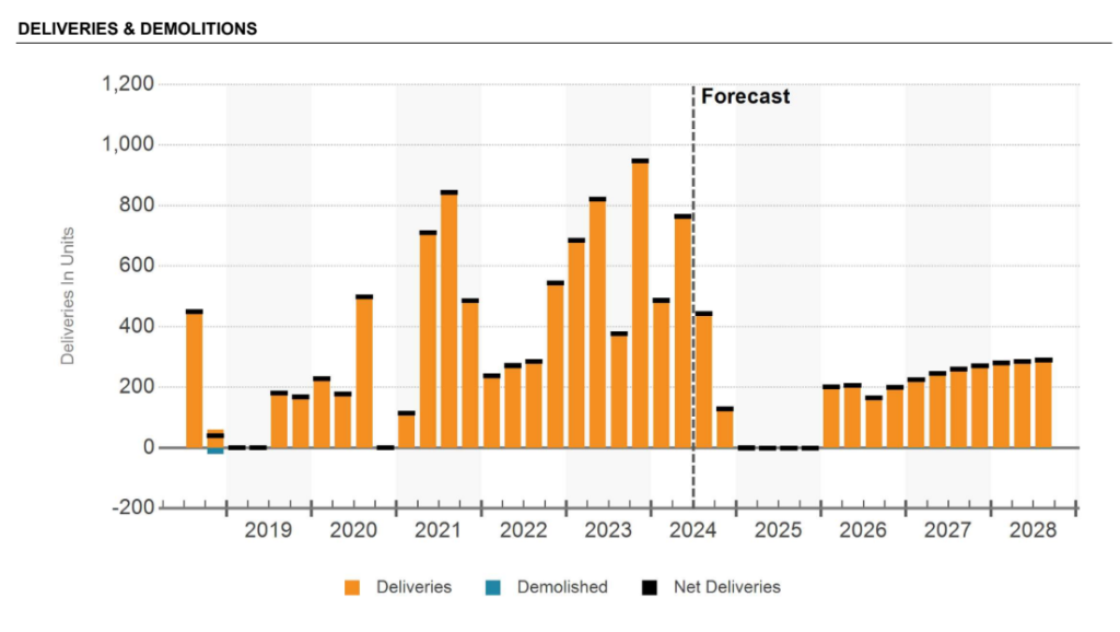 This is very pronounced in Sioux Falls, with permitting data in 2024 much lower than the same timeframe in 2023 and 2022, and projected deliveries falling off a cliff.