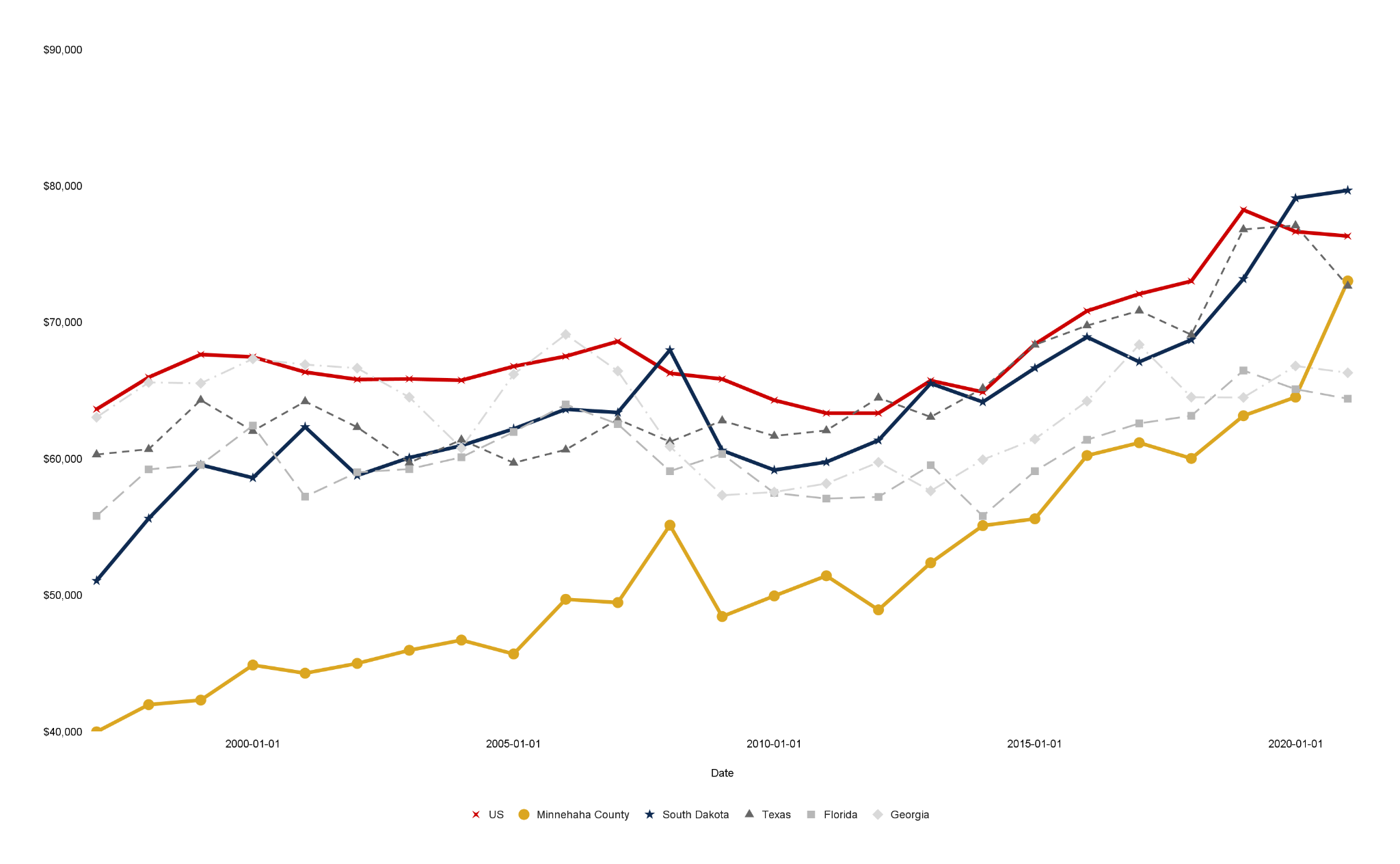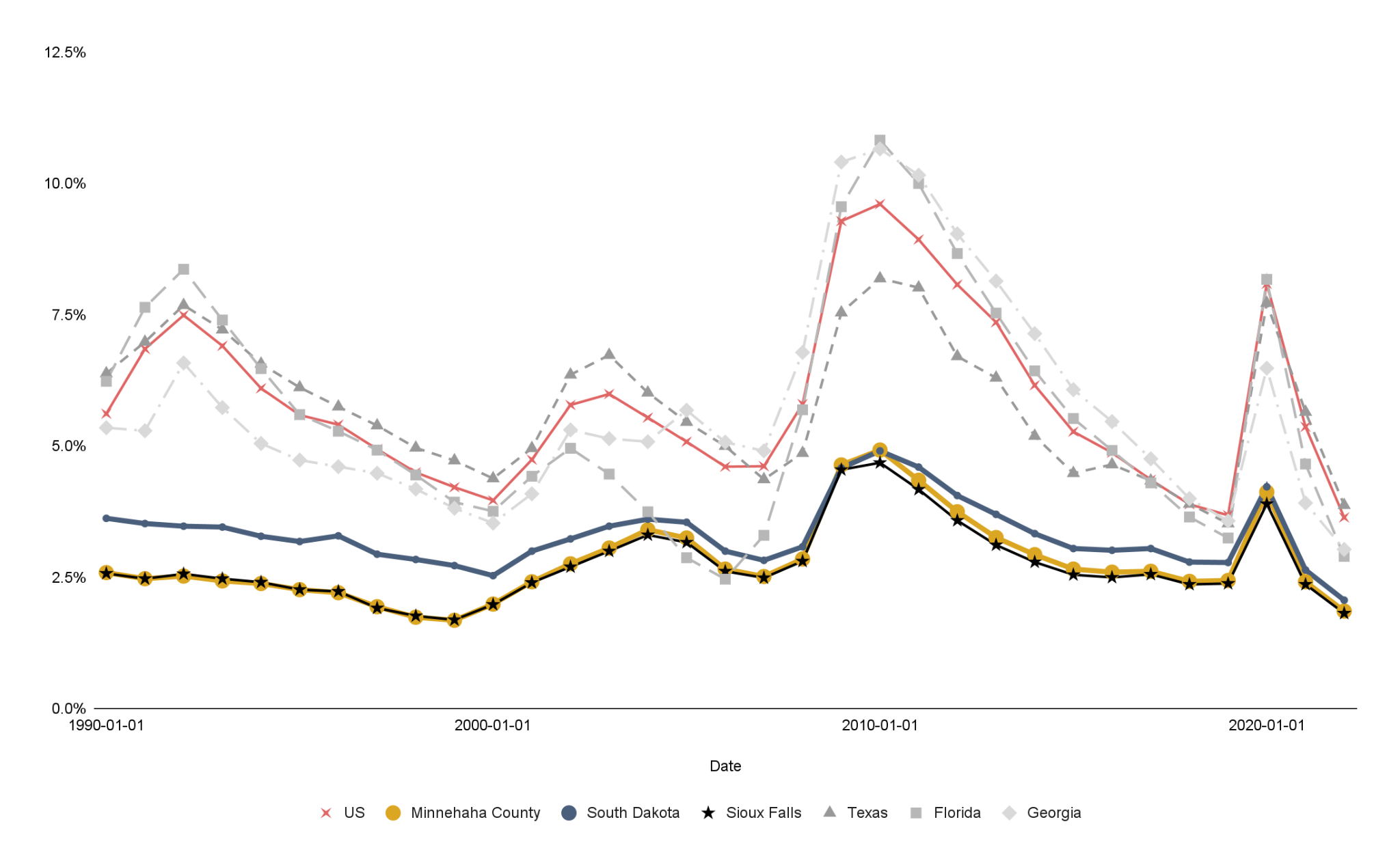 Sioux Falls consistently maintains a lower long-term unemployment rate than the national average and major markets like Texas, Florida, and Georgia.