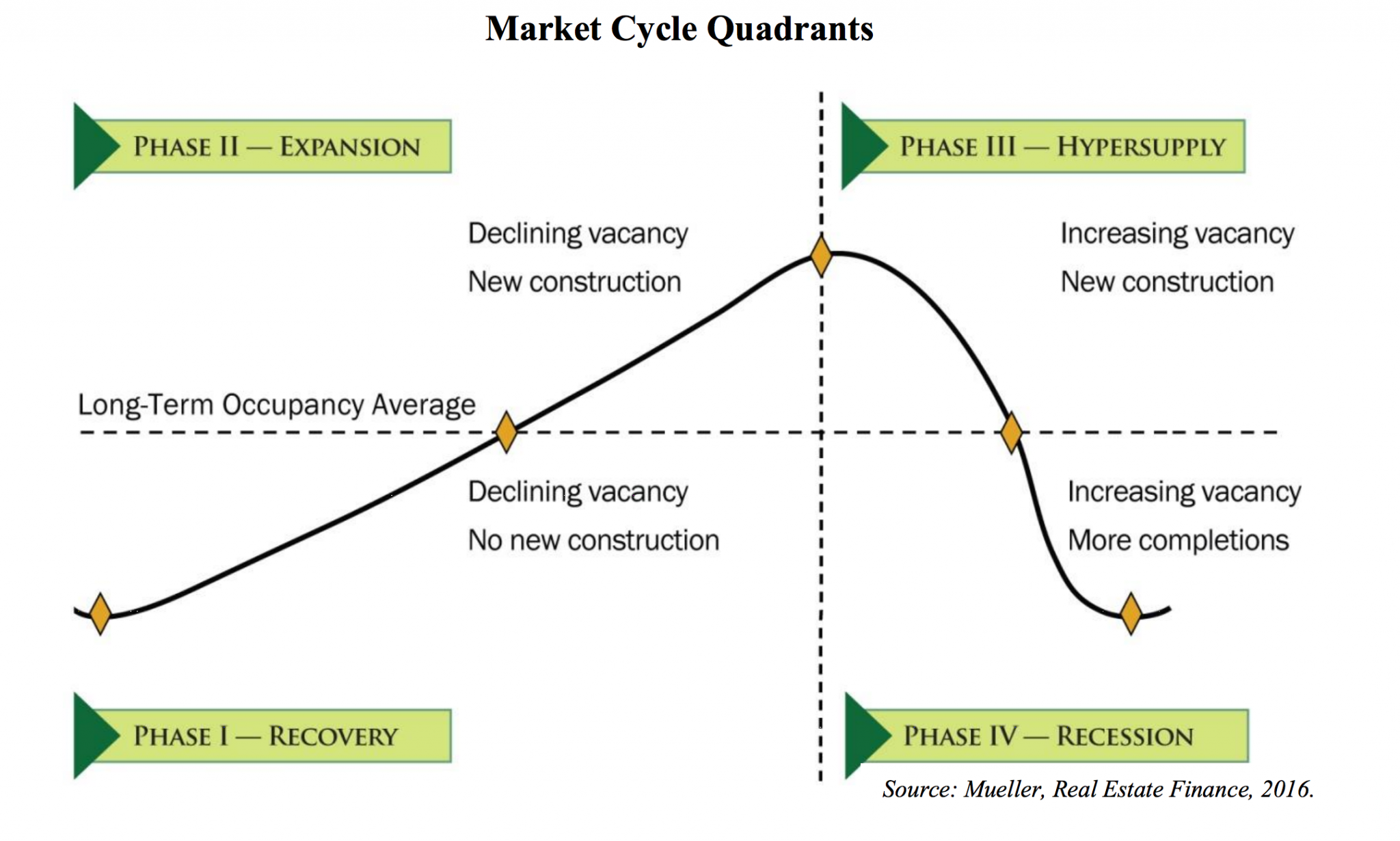Commercial real estate is a cyclical market. There are four phases to the real estate cycle. It’s critical to understand the progression of each phase with heightened sensitivity to identify investment opportunities, and risks, within the cycle especially when phases are on the verge of transitioning.